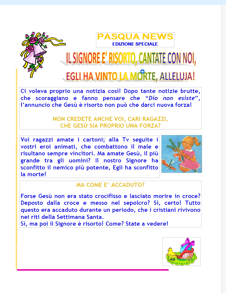 PASQUA DI RESURREZIONE La base della nostra fede è la resurrezione di Cristo. Gesù è davvero risorto! Se così non fosse, vana sarebbe la nostra fede: ciò significherebbe che tutto l'edificio del nostro credo non avrà ragione di esistere. Noi però crediamo che Gesù è veramente risorto: la dimostrazione è data dalla testimonianza delle apparizioni del Signore, il quale è apparso a persone che lo conoscevano bene e che non pensavano minimamente che il Maestro, anche se grande e potente, potesse risorgere dai morti.